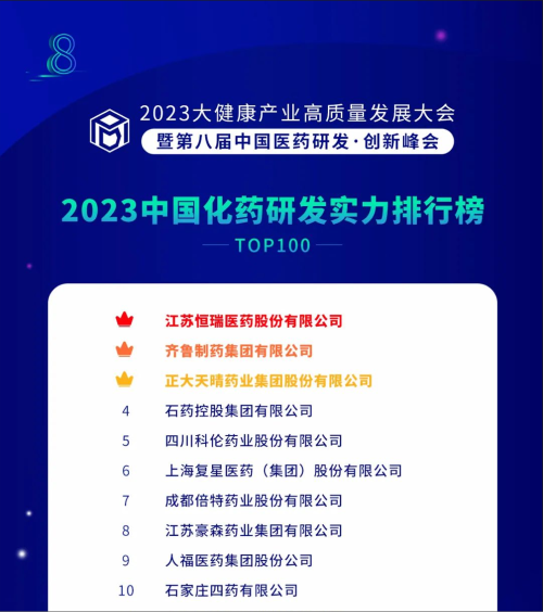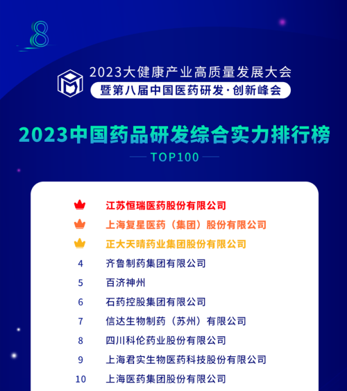 由药智网、中国药业杂志社主办的2023大健康产业高质量发展大会暨第八届中国医药研发•创新峰会于6月16日开幕,会上发布了《2023中国药品研发实力排行榜》系列榜单,九游会ag医药凭借深厚的创新研发实力再创辉煌:荣登《2023中国药品研发综合实力排行榜TOP100》榜首、《2023中国化药研发实力排行榜TOP100》榜首。值得一提的是,今年是九游会ag医药连续第6年入选《中国药品研发综合实力排行榜》榜首。