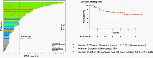 首次评估的中位TTR为1.9个月(范围:1.7-3.8个月),6个月DoR为75%,中位DoR未达到(95% CI:7.8-NR)。