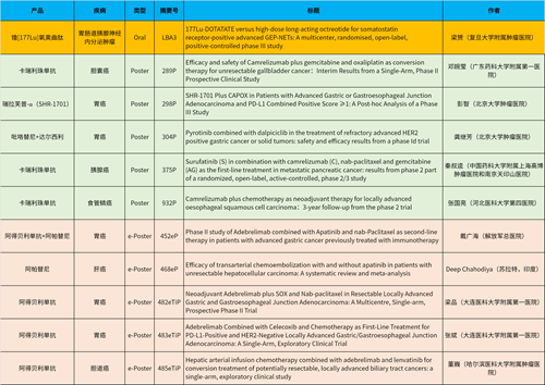在消化系统肿瘤领域,九游会ag产品相关研究共入选1项最新突破性摘要(LBA)、5项壁报和5项电子壁报,共11项研究。其中阿得贝利单抗入选4项研究、卡瑞利珠单抗入选3项研究。